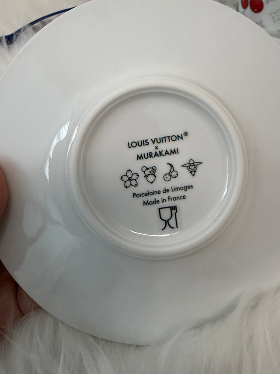 The elegant and eye-catching LV x TM Set of 2 Teacups and Saucers was created for the exclusive re-edition of the Louis Vuitton x Takashi Murakami Collection. Fine Limoges porcelain is enlivened with pairs of vibrant, colourful Murakami-style cherries against a subtle Monogram background for a discreet House signature. A perfect match for the teapot from the collection, they make teatime a joyous, festive experience.